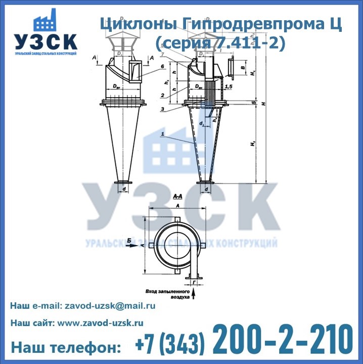 Циклоны Гипродревпрома Ц (серия 7.411-2) высокого качества можно купить в компании «УЗСК» в Омске. Наши специалисты предоставят всю необходимую информацию информацию и помогут с выбором модели циклона. Подробные технические характеристики, конструкцию, параметры, ассортимент и стоимость продукции можно также найти на сайте УЗСК.